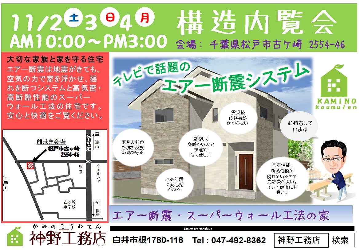 11月2日3日4日の3連休に 神野工務店構造内覧会を開催しております。 時間 10時から15時 場所 千葉県松戸市古ヶ崎2554-46 テレビで話題の「エアー断震システム」を取り入れた施工の住宅です。 地震で揺れない 宙に浮く家 「エアー断震」 空気の力で地震から家を守ります。 今、テレビなどで話