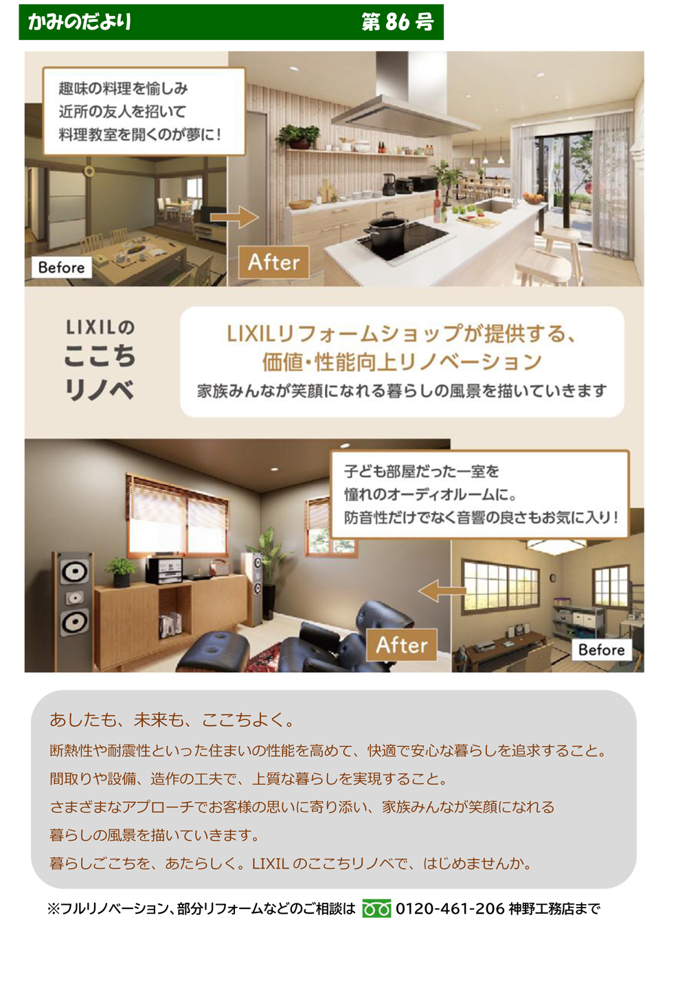 ※フルリノベーション、部分リフォームなどのご相談はフリーダイヤル0120-461-206 神野工務店までご連絡ください。